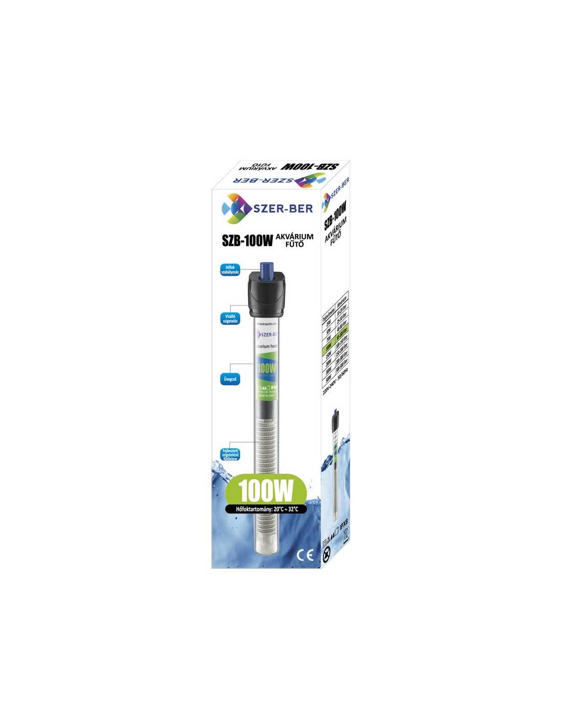 Încălzitor termostatic pentru acvariu SZER-BER. O tijă de încălzire acoperită cu sticlă care asigură în mod fiabil temperatura ideală pentru acvariul tău. Temperatura apei poate fi reglată cu ușurință folosind cadranul de pe partea de sus a încălzitorului folosind scala de temperatură. Dispozitiv complet impermeabil, dublu izolat, sigur. Indicatorul LED clar vizibil arată întotdeauna când încălzitorul funcționează. Controlul temperaturii poate fi reglat intre 20-32°C, iar aparatul functioneaza cu o precizie de +/-1°C. Putere 100W, recomandata pentru acvariile de 50-100 litri.