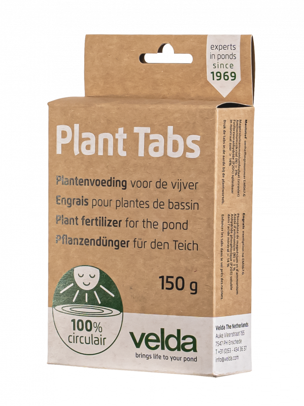 Plant Tabs sunt tablete nutritive cu eliberare susținută de îngrășăminte naturale. Apa uzată conține materiale valoroase pentru creșterea plantelor. Având în vedere aceste cunoștințe, Velda a creat o tabletă nutritivă din produsul rezidual al purificării apei . Această reutilizare este mai bună pentru planetă. Potrivită pentru toate tipurile de plante de iaz. Aplicați tabletele în zona imediată a rădăcinilor plantelor. Nu folosiți pământ de grădină pentru plantarea plantelor de iaz, ci doar pământ special pentru iaz .